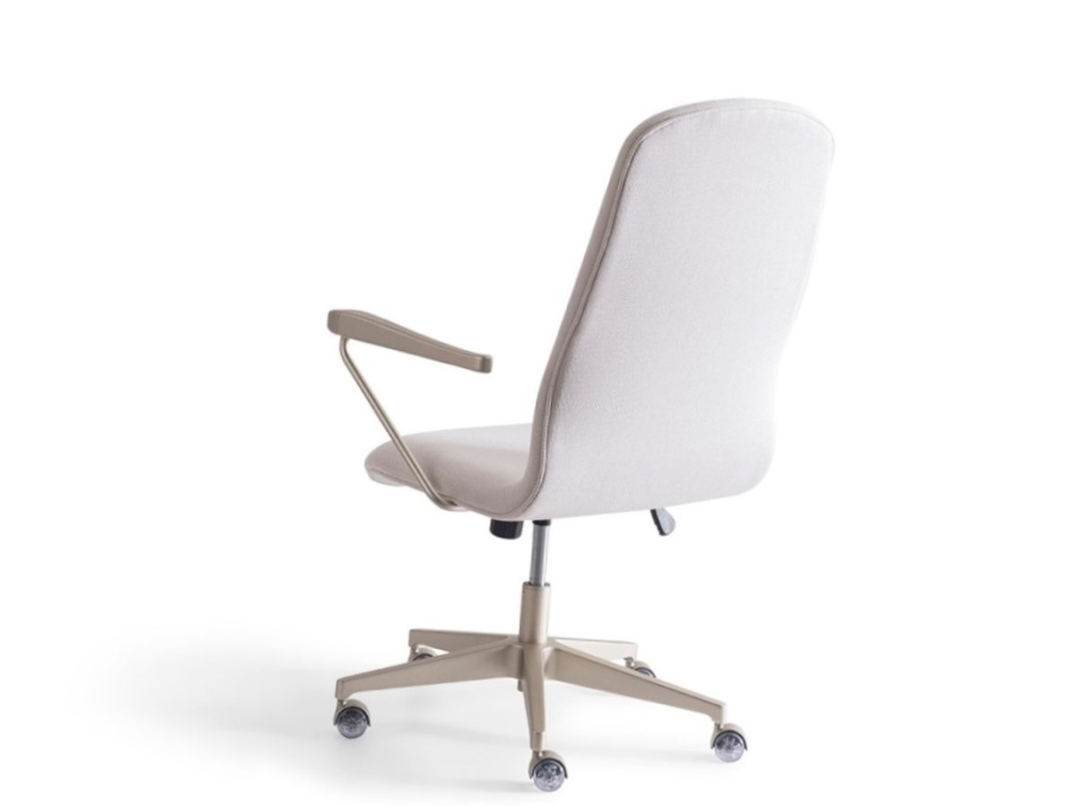 Linhas suaves, conforto absoluto. Homenageando a Almirante Elizabeth Shelby, a cadeira Elizabeth combina elegância e ergonomia em um design sofisticado. Suas curvas delicadas e apoio para as costas em elipse proporcionam um toque de leveza sem abrir mão do suporte ideal. Com regulagem de altura e base giratória, é perfeita para quem busca conforto e presença marcante no ambiente de trabalho. Seu rodízio em silicone oferece delicadeza ao conjunto.
